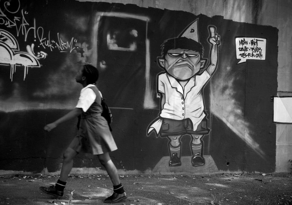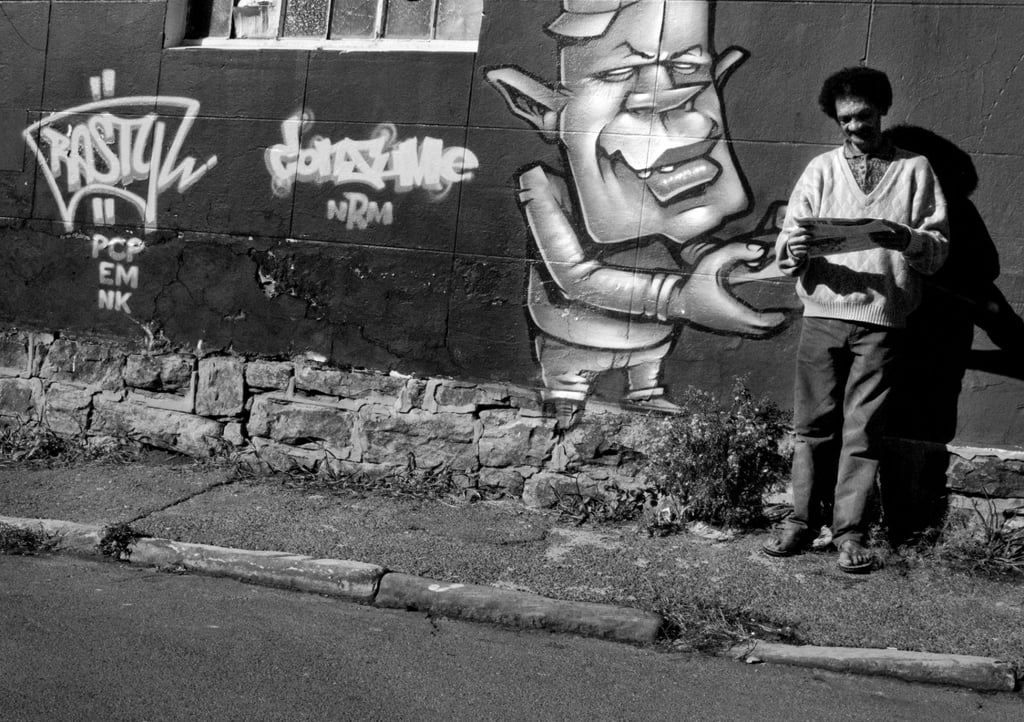 Photographed in the Brixton area of Johannesburg, Yesterday’s News captures a fleeting moment of quiet humour and curiosity. A man stands absorbed in a discarded newspaper he has retrieved from a nearby bin, while beside him, a painted graffiti figure stretches out an eager hand, as if wanting to snatch the paper to catch up on the headlines himself.