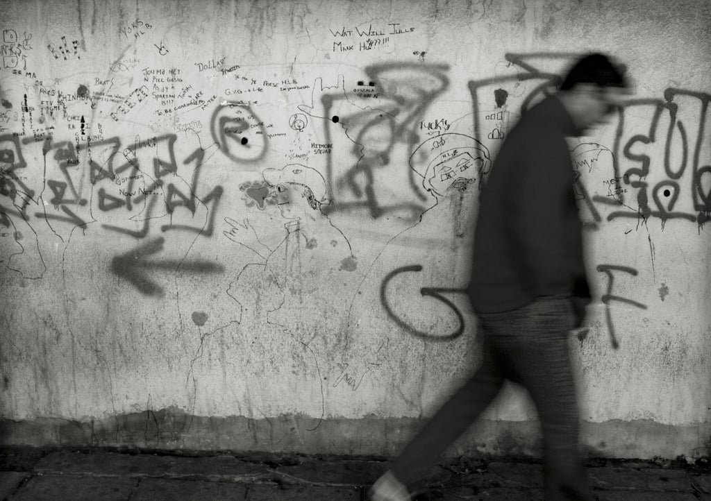Captured in Johannesburg, Rock and Roll China finds humour and rhythm in a fleeting city moment. On a graffiti-covered wall, a sketched figure raises his hand in a classic rock and roll gesture — an enthusiastic salute to the world passing by. In the same instant, a pedestrian strides past, unaware of the playful exchange waiting to unfold behind him.