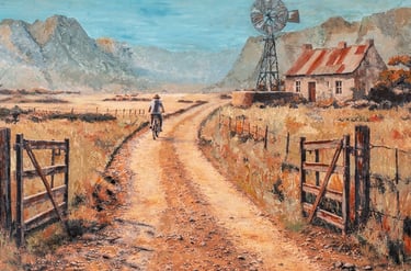 When painting Fields of Gold, I consciously resisted the temptation to introduce the brighter greens and yellows we might associate with farmland. Instead, I chose to stay faithful to the region's emotional experience — those muted earth tones that define the Karoo's character.